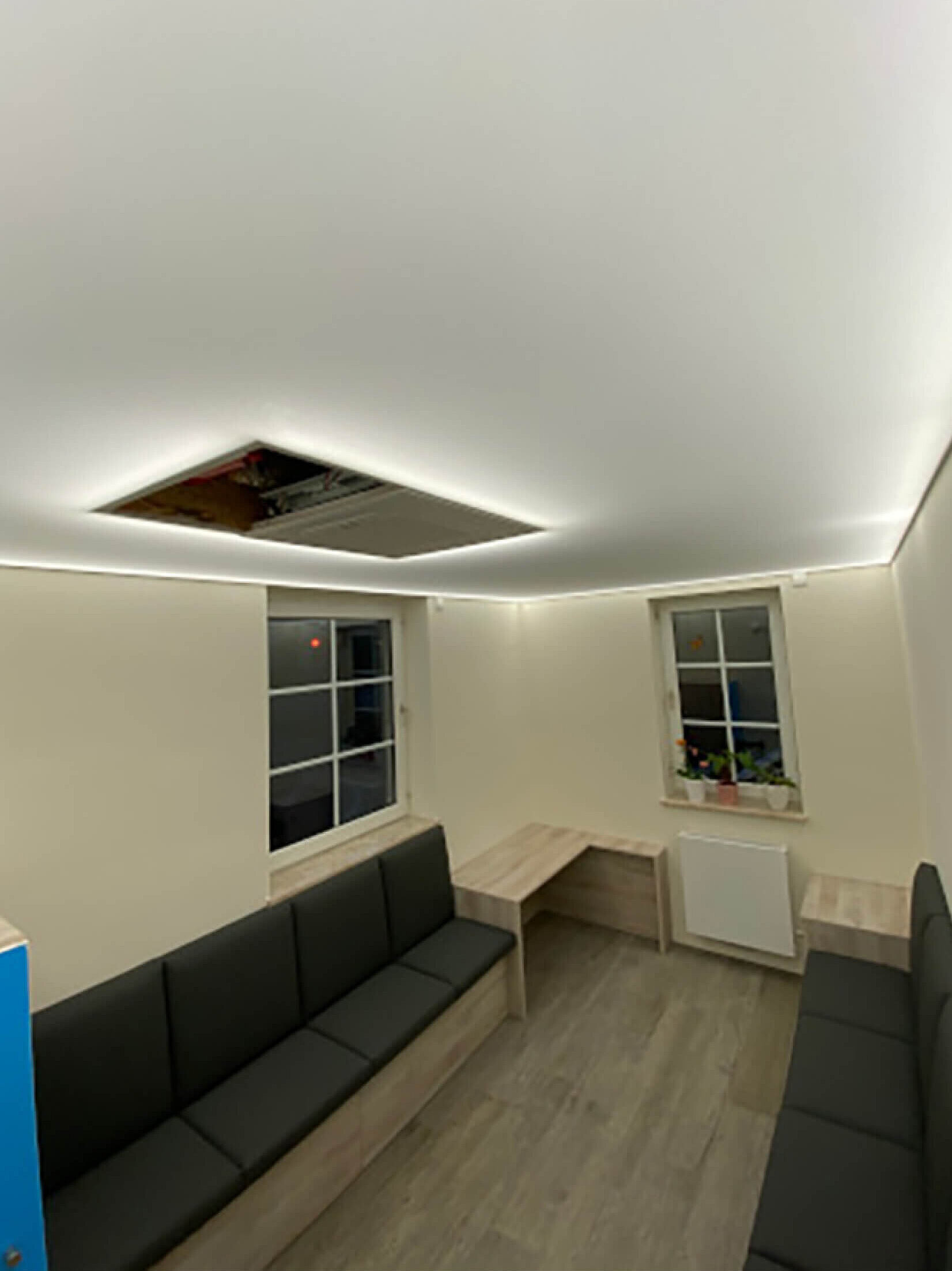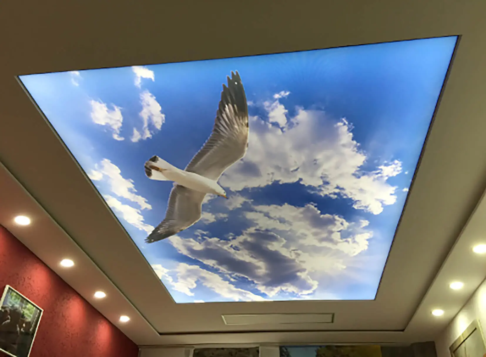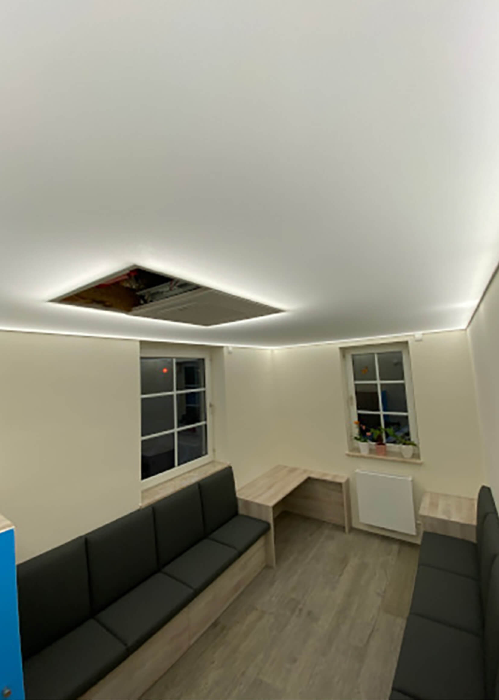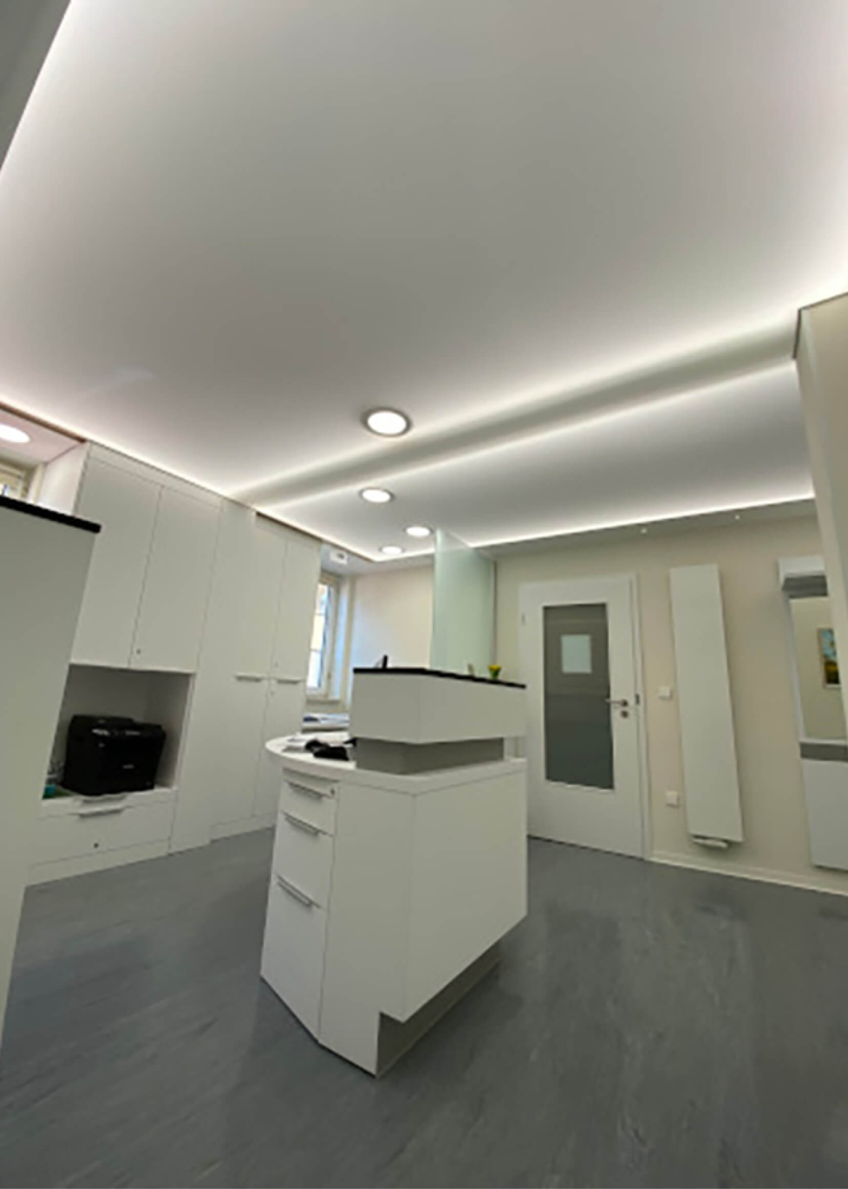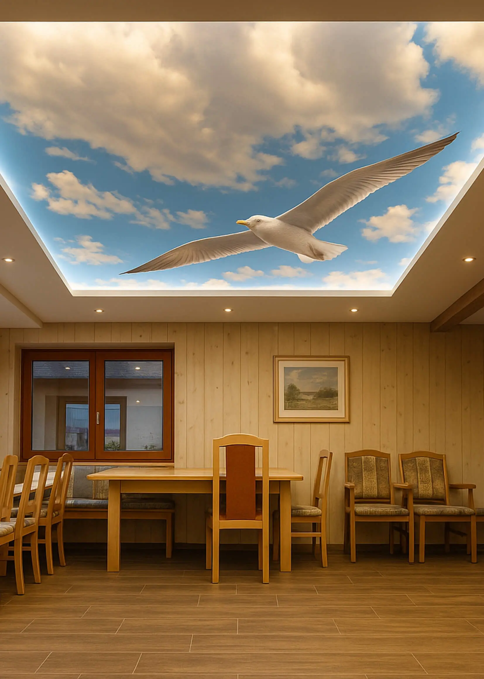 Eine Spanndecke mit Digitaldruck und LED-Hinterleuchtung schafft ein angenehmes, stimmungsvolles Ambiente und sorgt für eine indirekte, gleichmäßige Ausleuchtung des Raumes. Durch die Kombination von Spanndecke und hinterleuchtetem LED-System entsteht eine moderne Lichtlösung, die dem Raum eine freundliche und einladende Atmosphäre verleiht.
