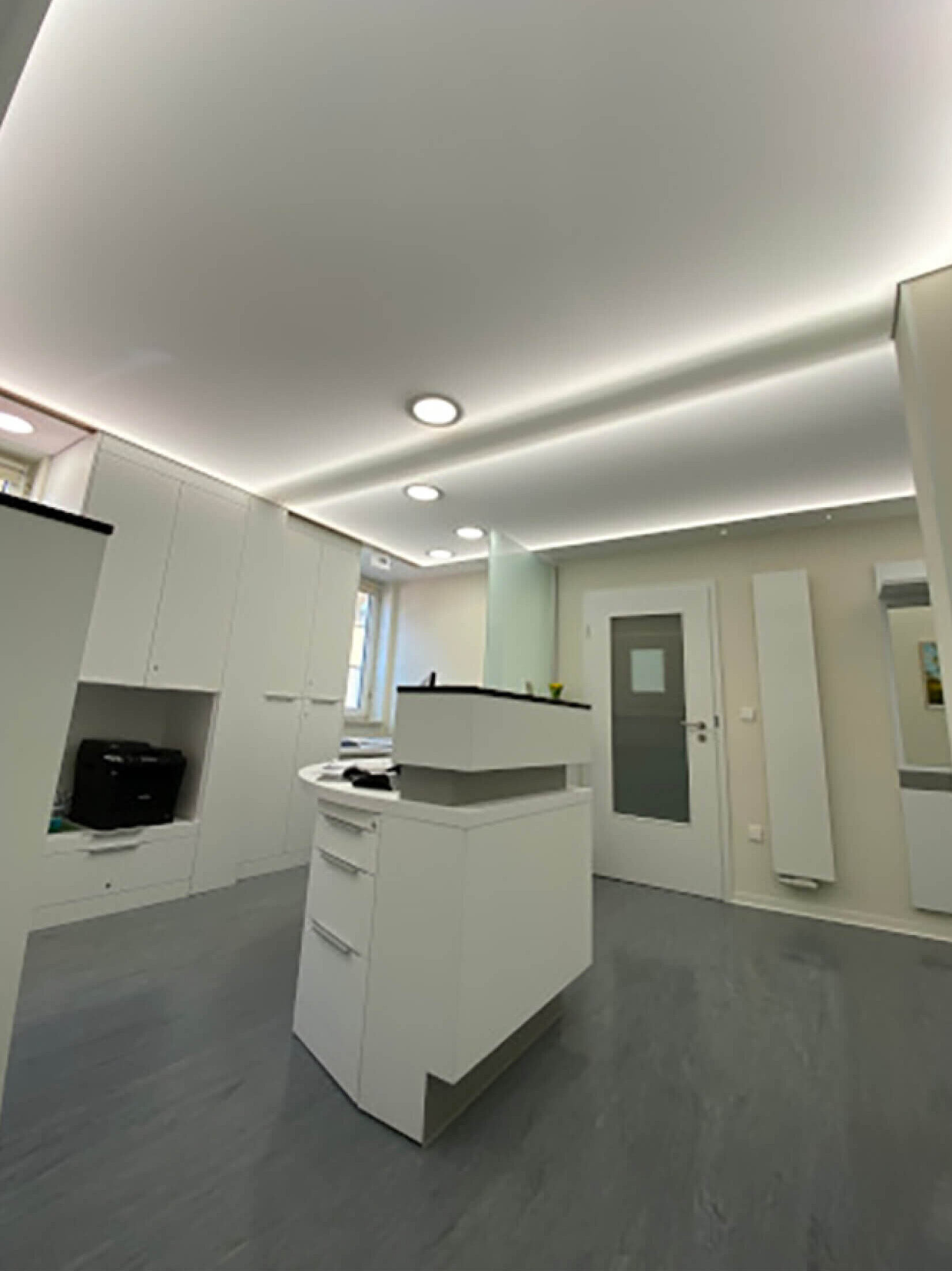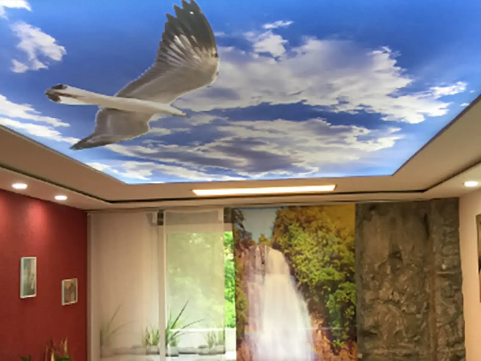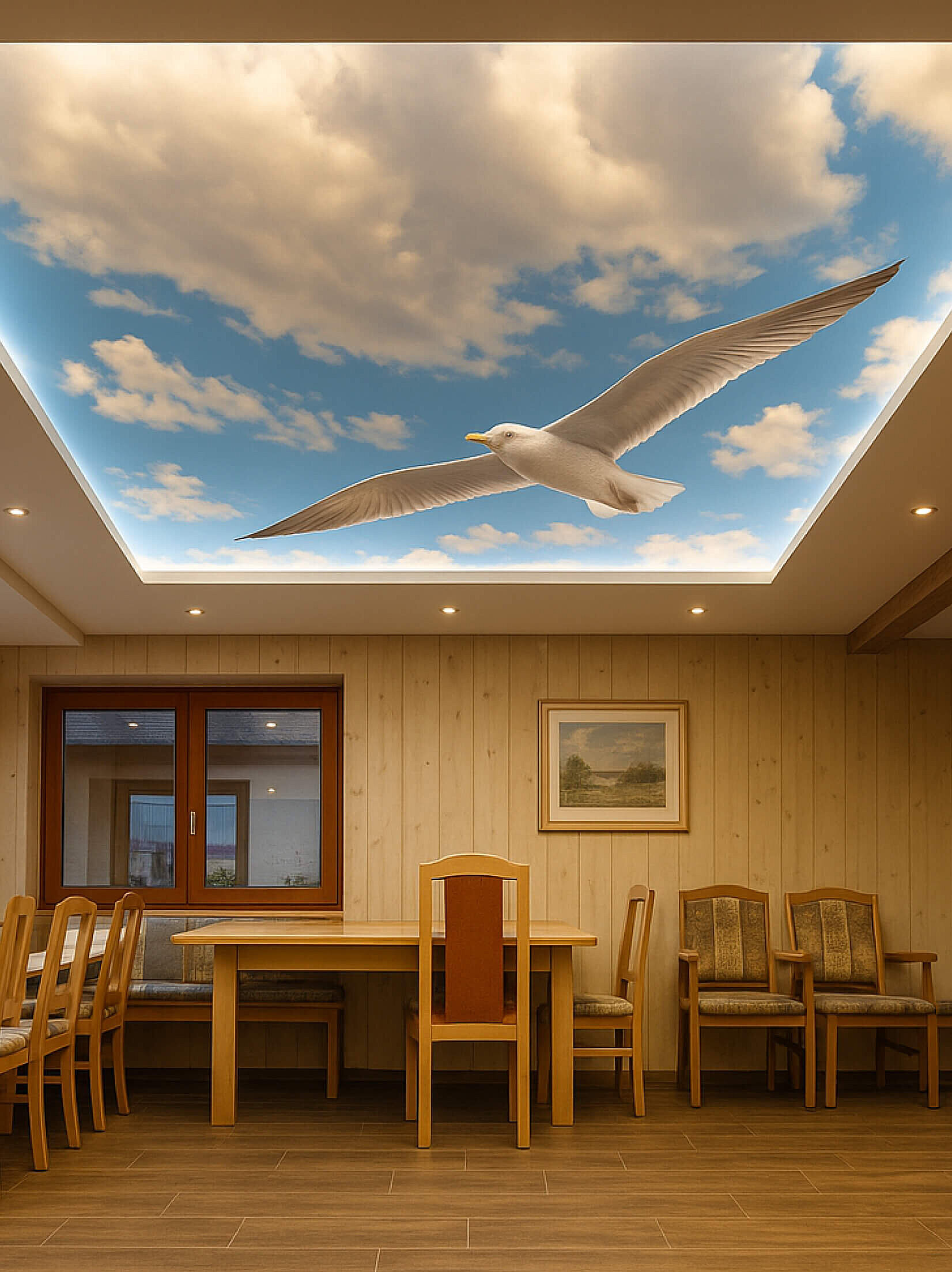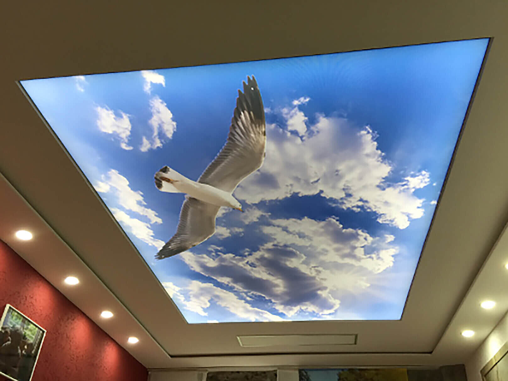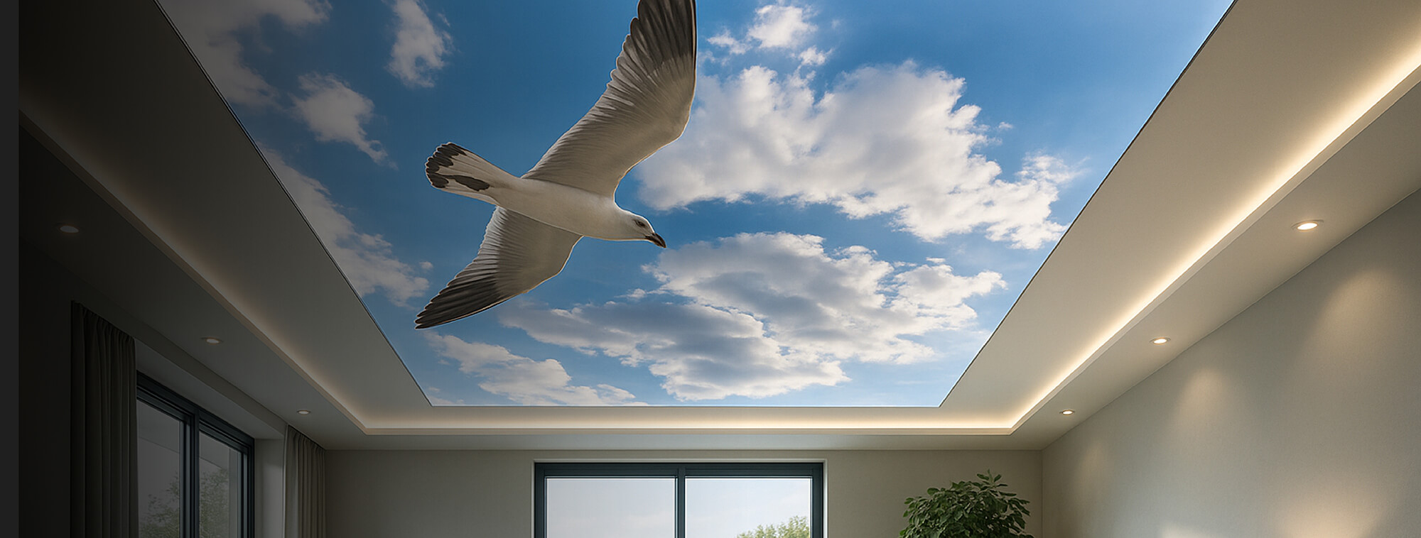 Eine Spanndecke mit Digitaldruck und LED-Hinterleuchtung schafft ein angenehmes, stimmungsvolles Ambiente und sorgt für eine indirekte, gleichmäßige Ausleuchtung des Raumes. Durch die Kombination von Spanndecke und hinterleuchtetem LED-System entsteht eine moderne Lichtlösung, die dem Raum eine freundliche und einladende Atmosphäre verleiht.