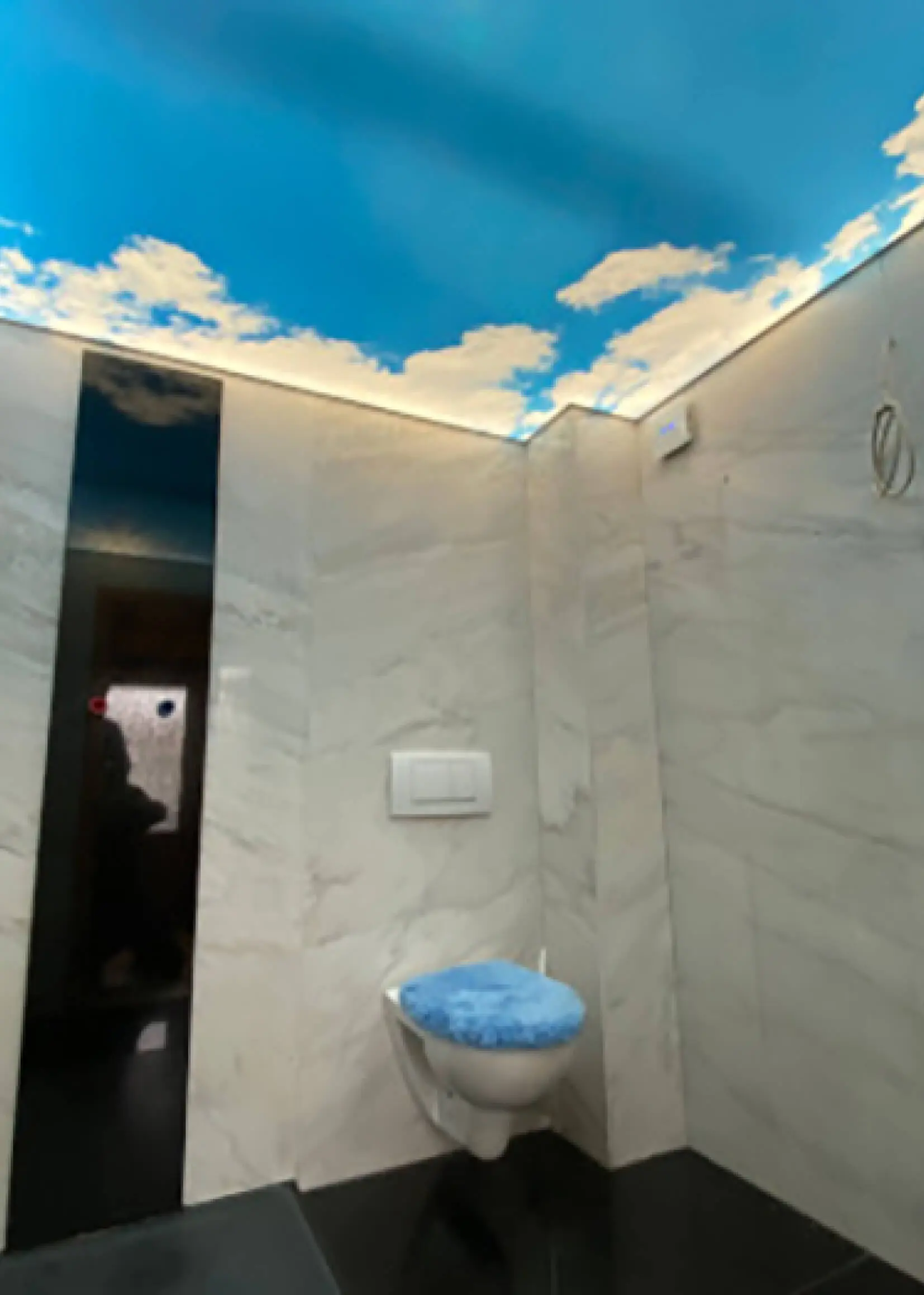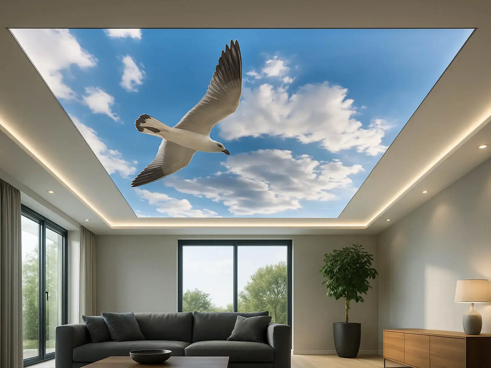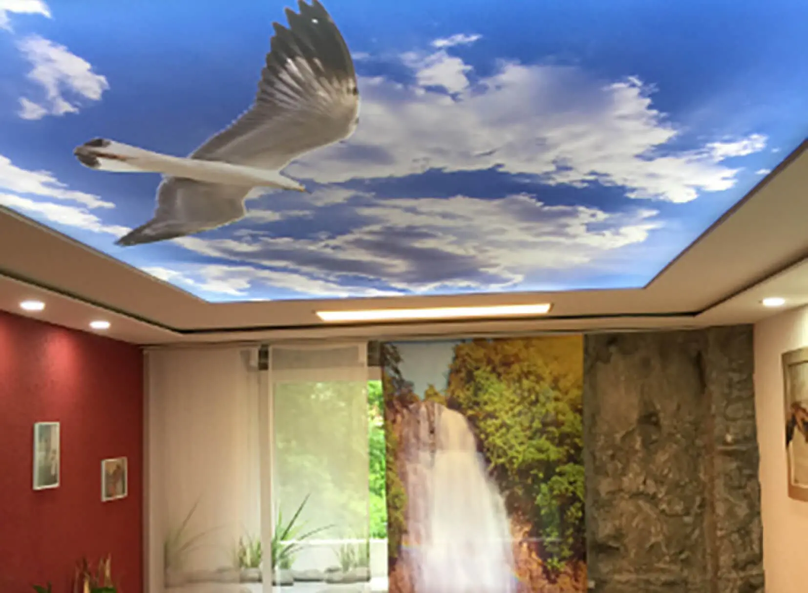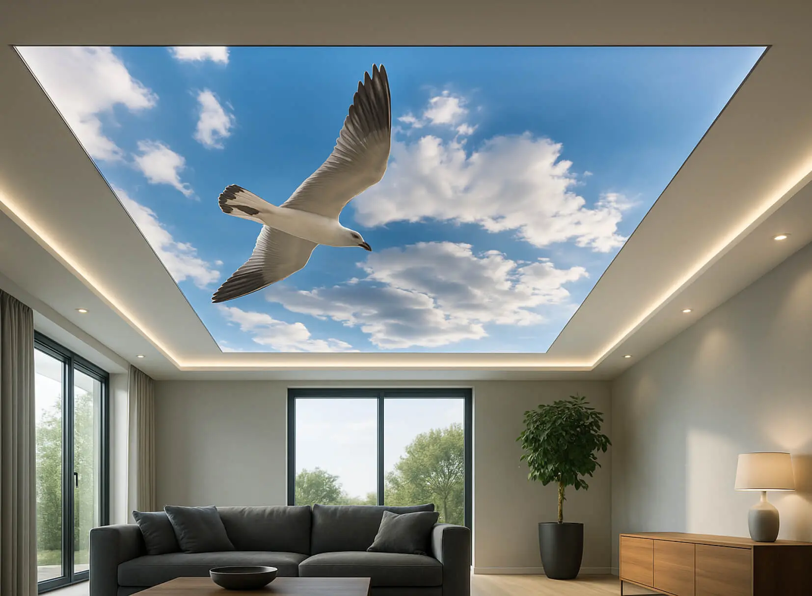 Eine Spanndecke mit Digitaldruck und LED-Hinterleuchtung schafft ein angenehmes, stimmungsvolles Ambiente und sorgt für eine indirekte, gleichmäßige Ausleuchtung des Raumes. Durch die Kombination von Spanndecke und hinterleuchtetem LED-System entsteht eine moderne Lichtlösung, die dem Raum eine freundliche und einladende Atmosphäre verleiht.