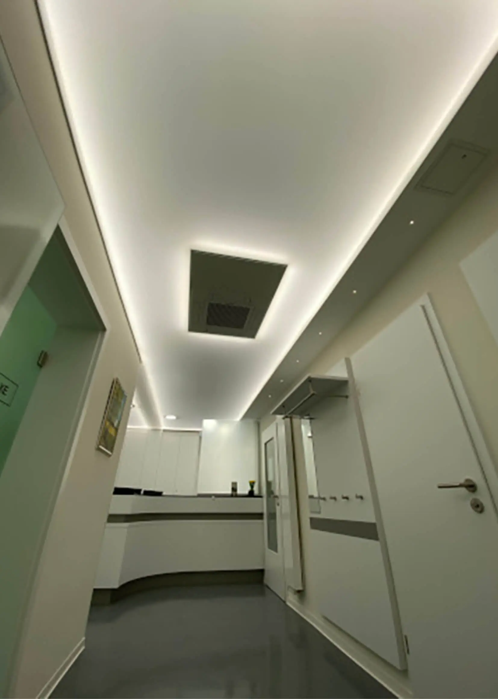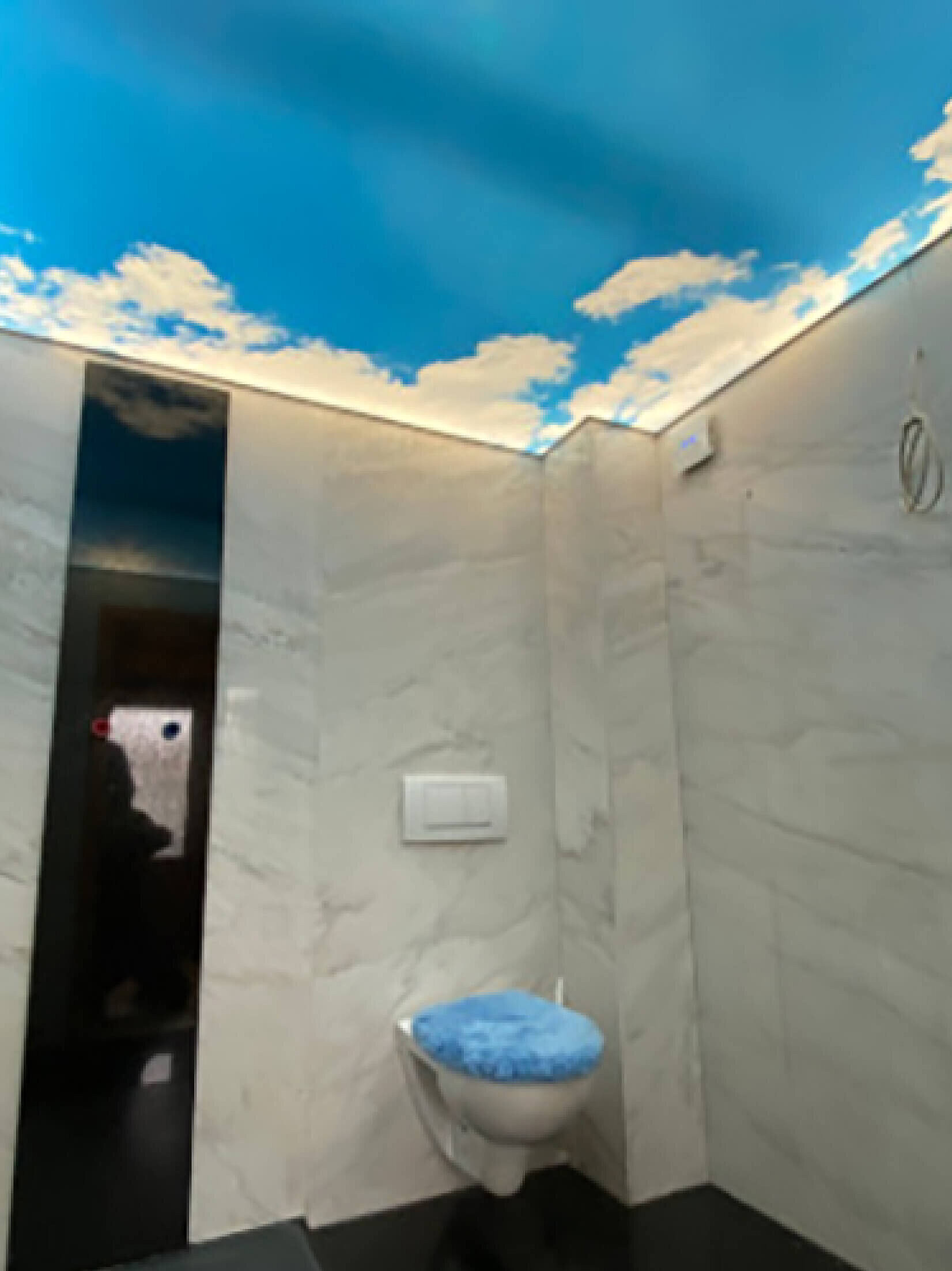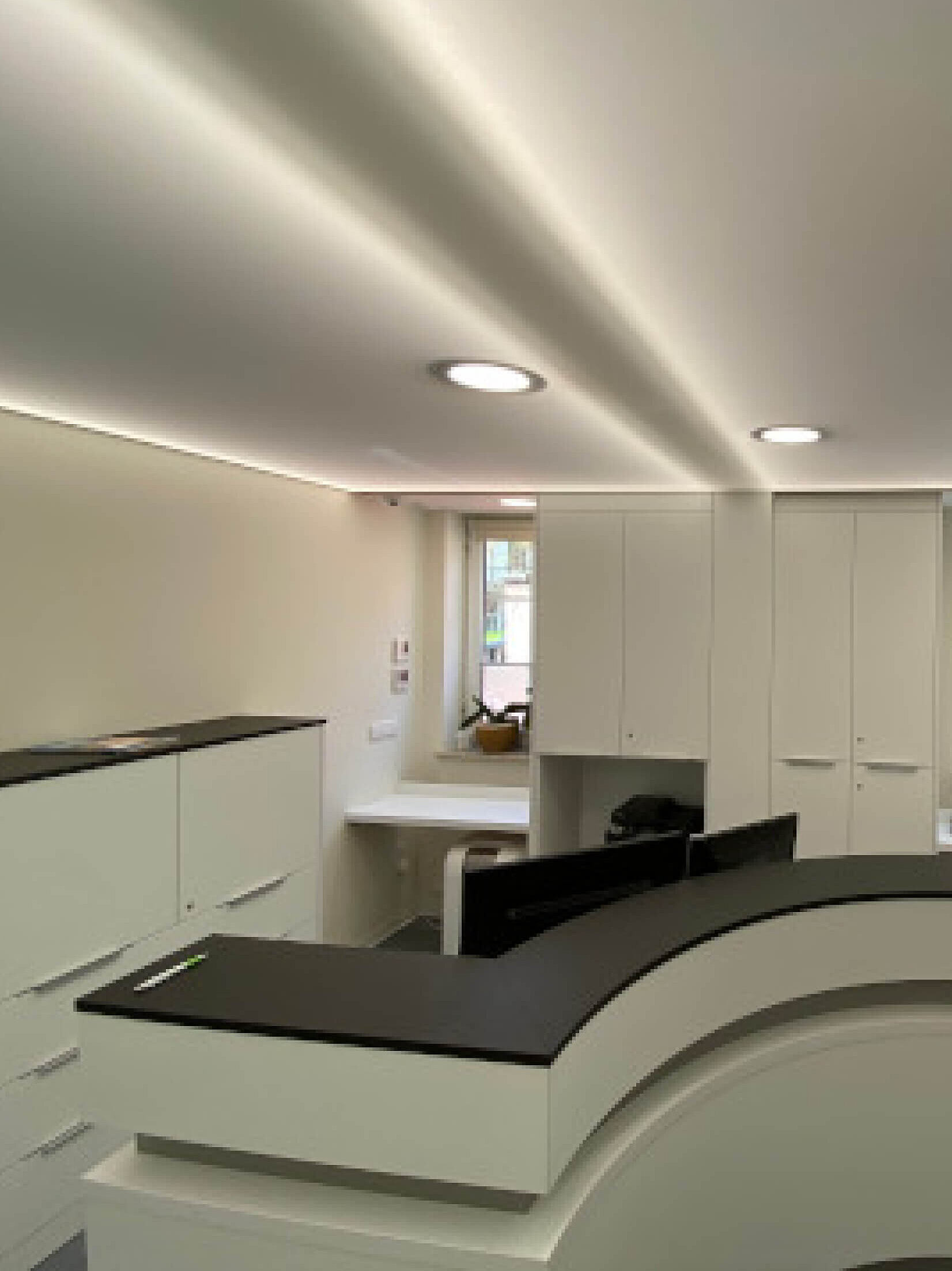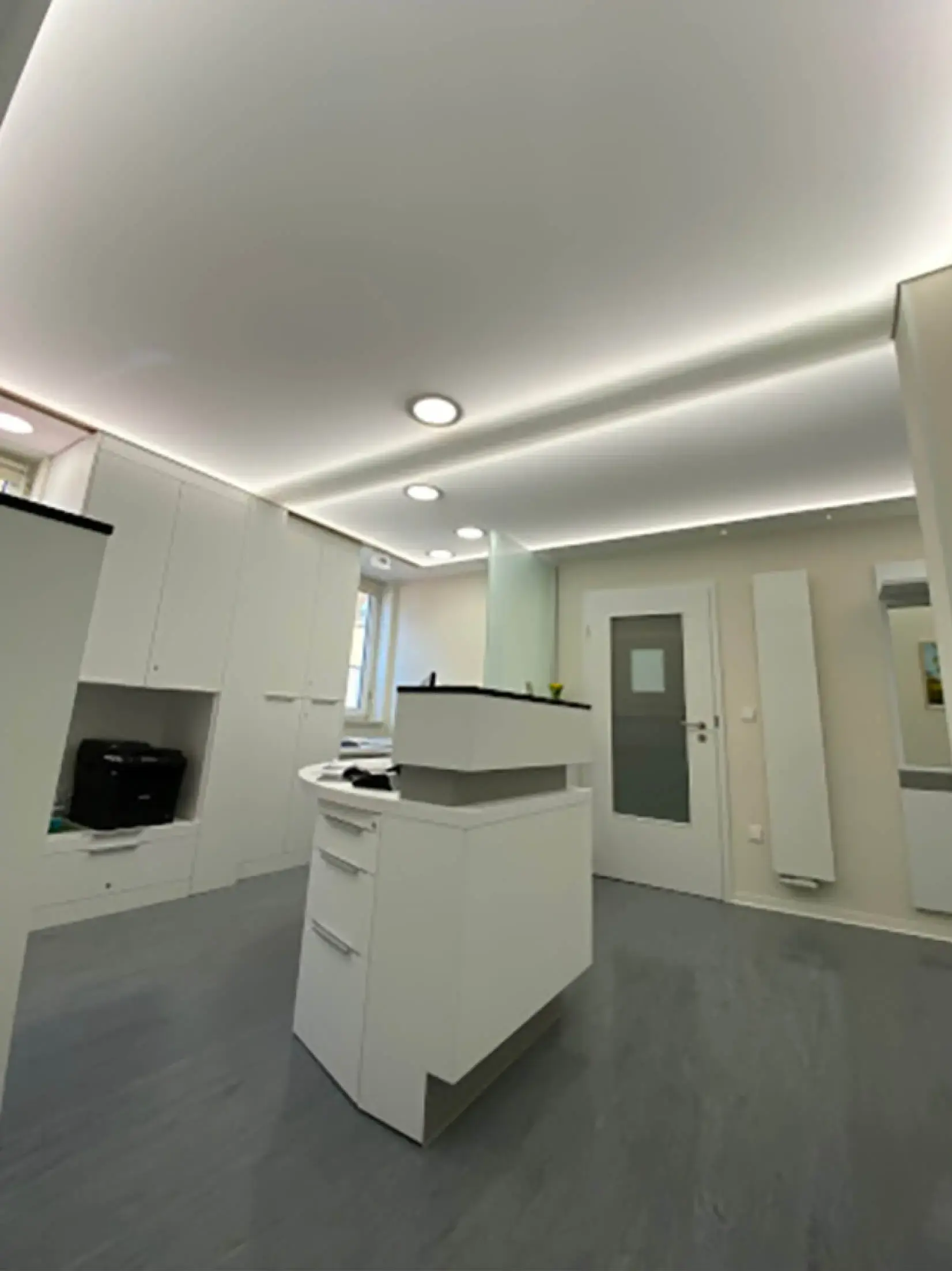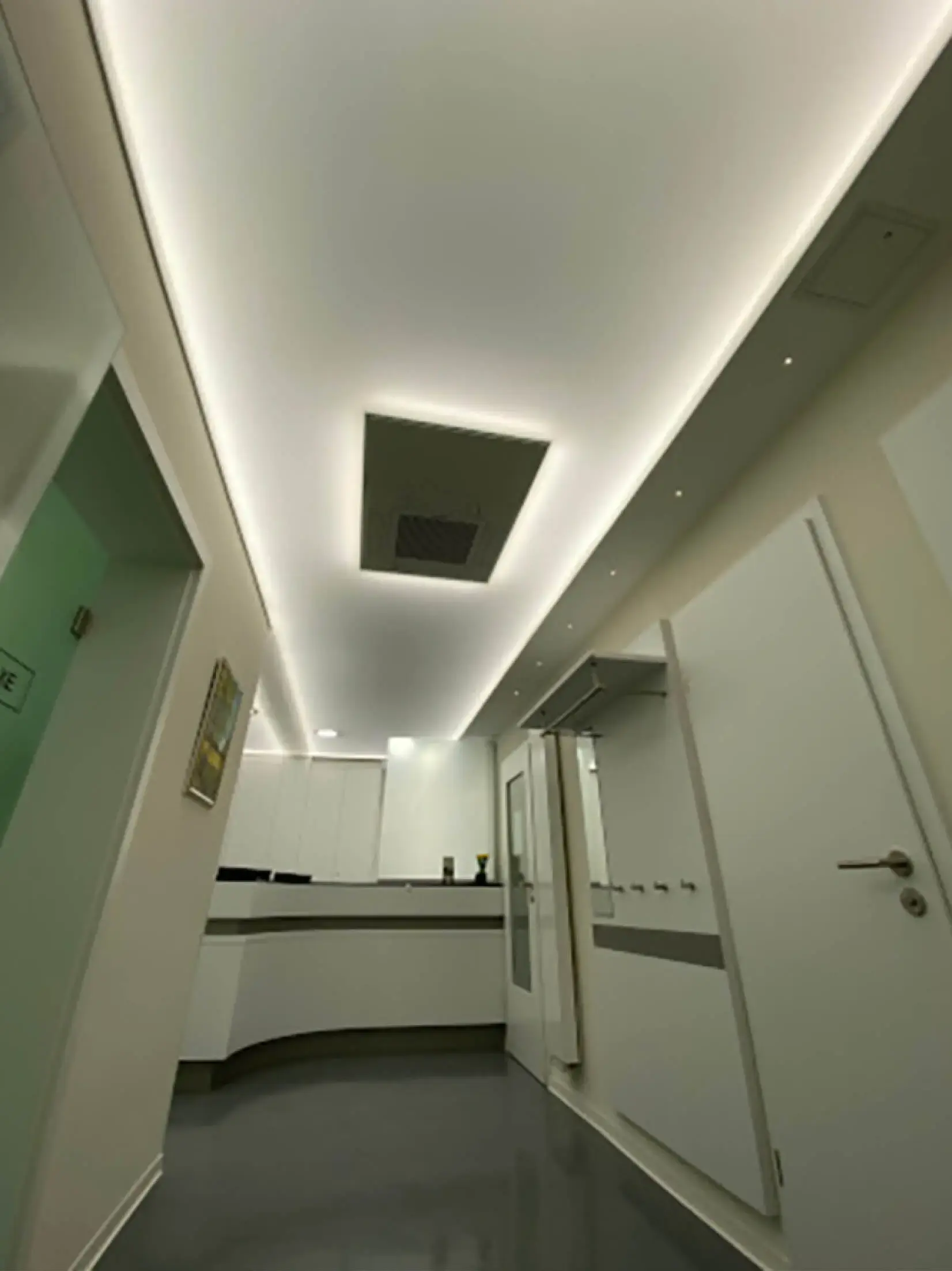 Eine Spanndecke mit Digitaldruck und LED-Hinterleuchtung schafft ein angenehmes, stimmungsvolles Ambiente und sorgt für eine indirekte, gleichmäßige Ausleuchtung des Raumes. Durch die Kombination von Spanndecke und hinterleuchtetem LED-System entsteht eine moderne Lichtlösung, die dem Raum eine freundliche und einladende Atmosphäre verleiht.