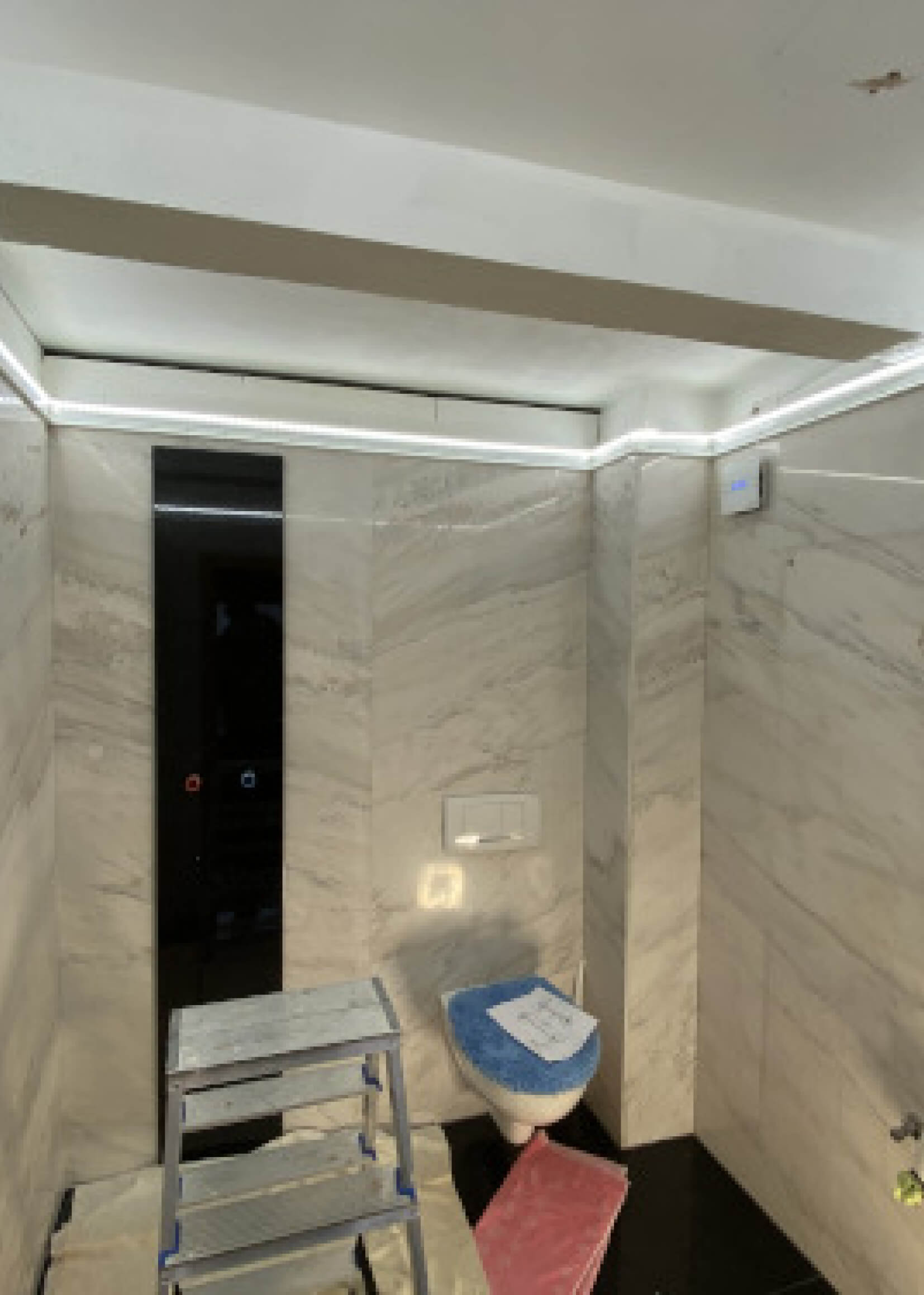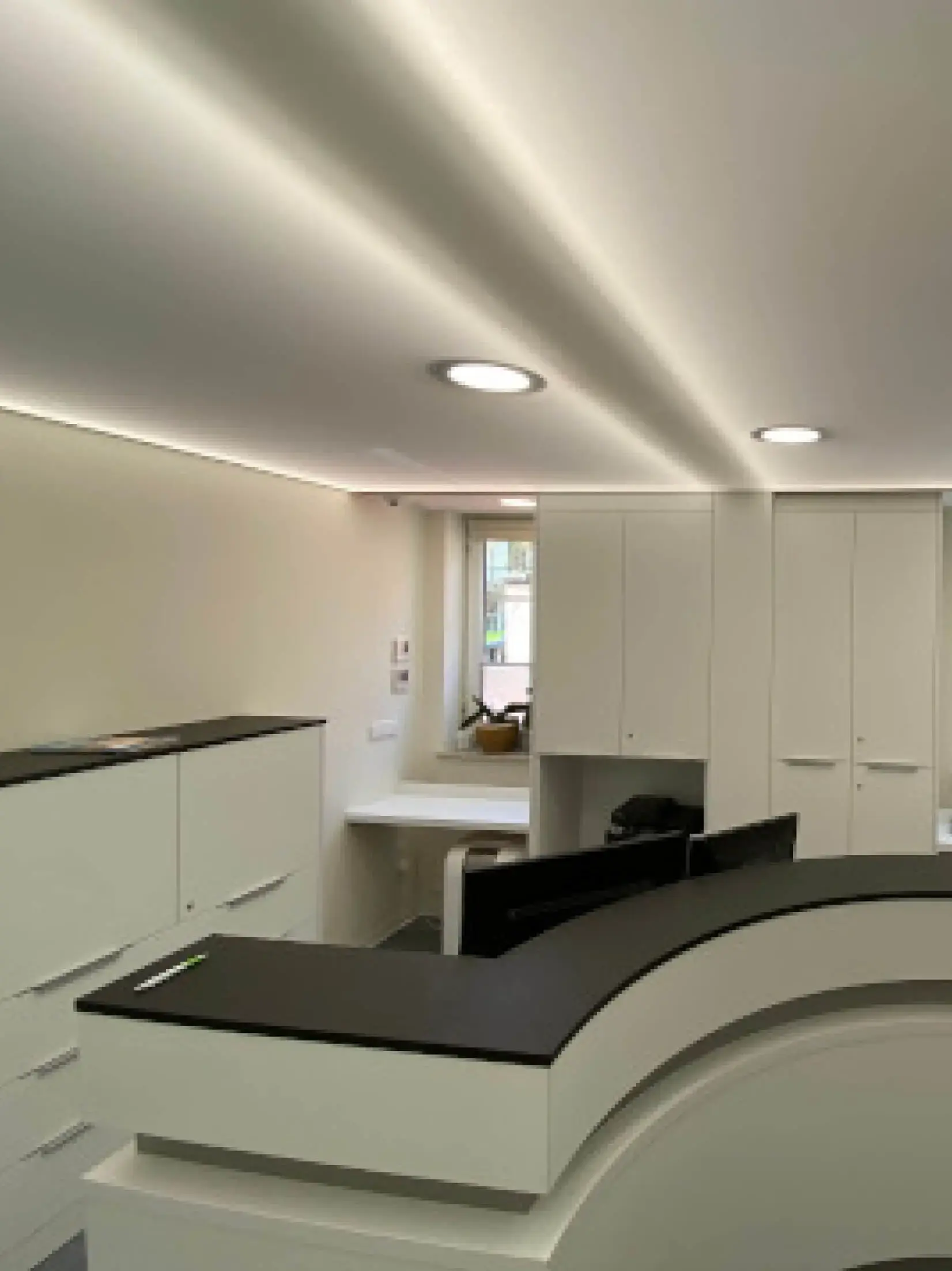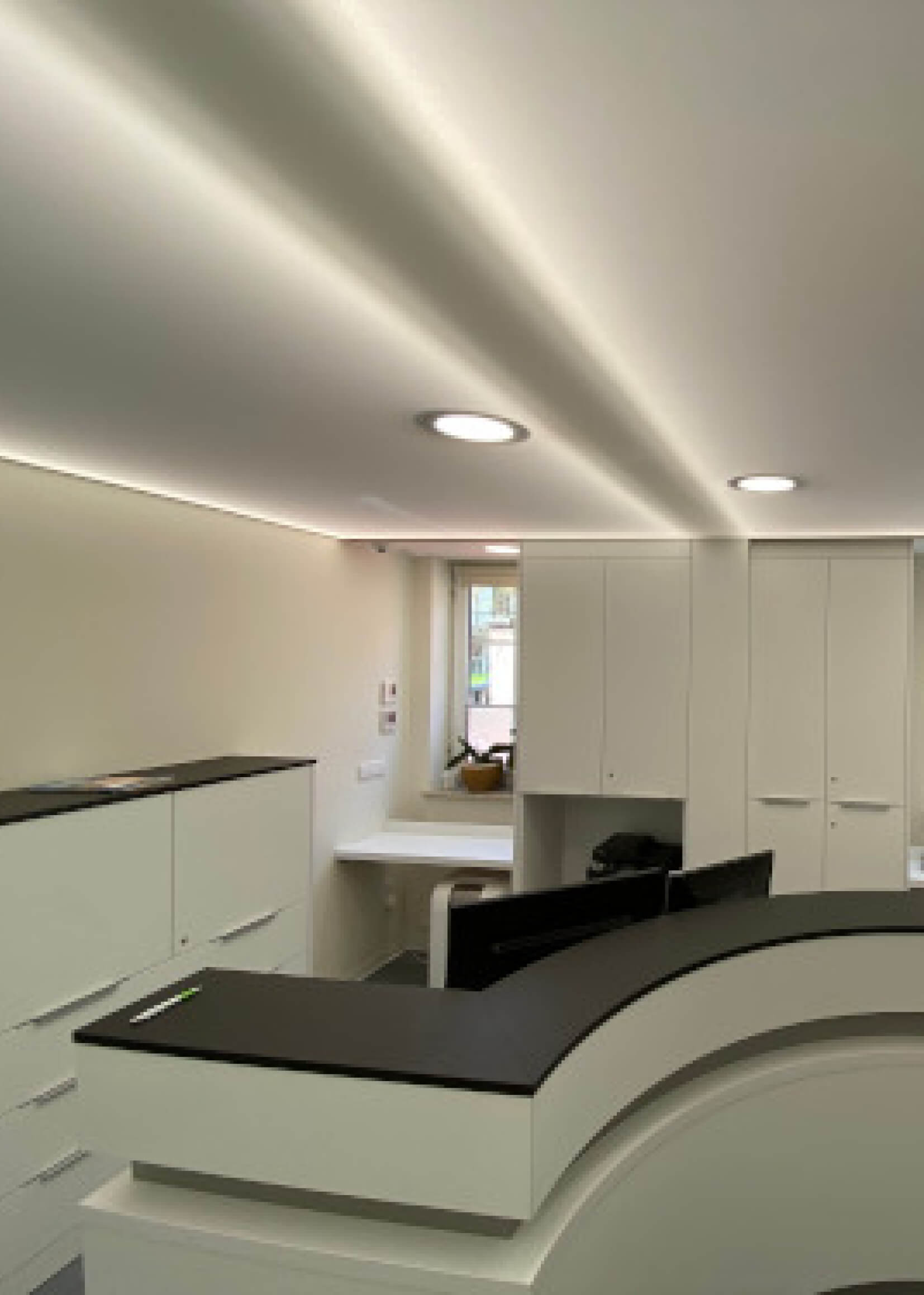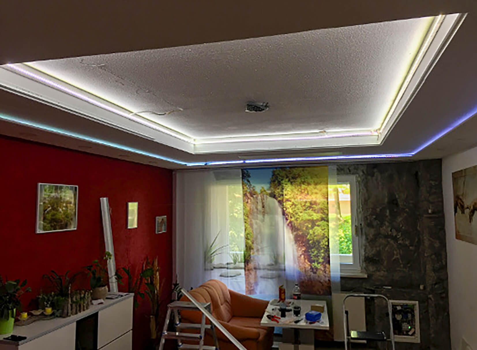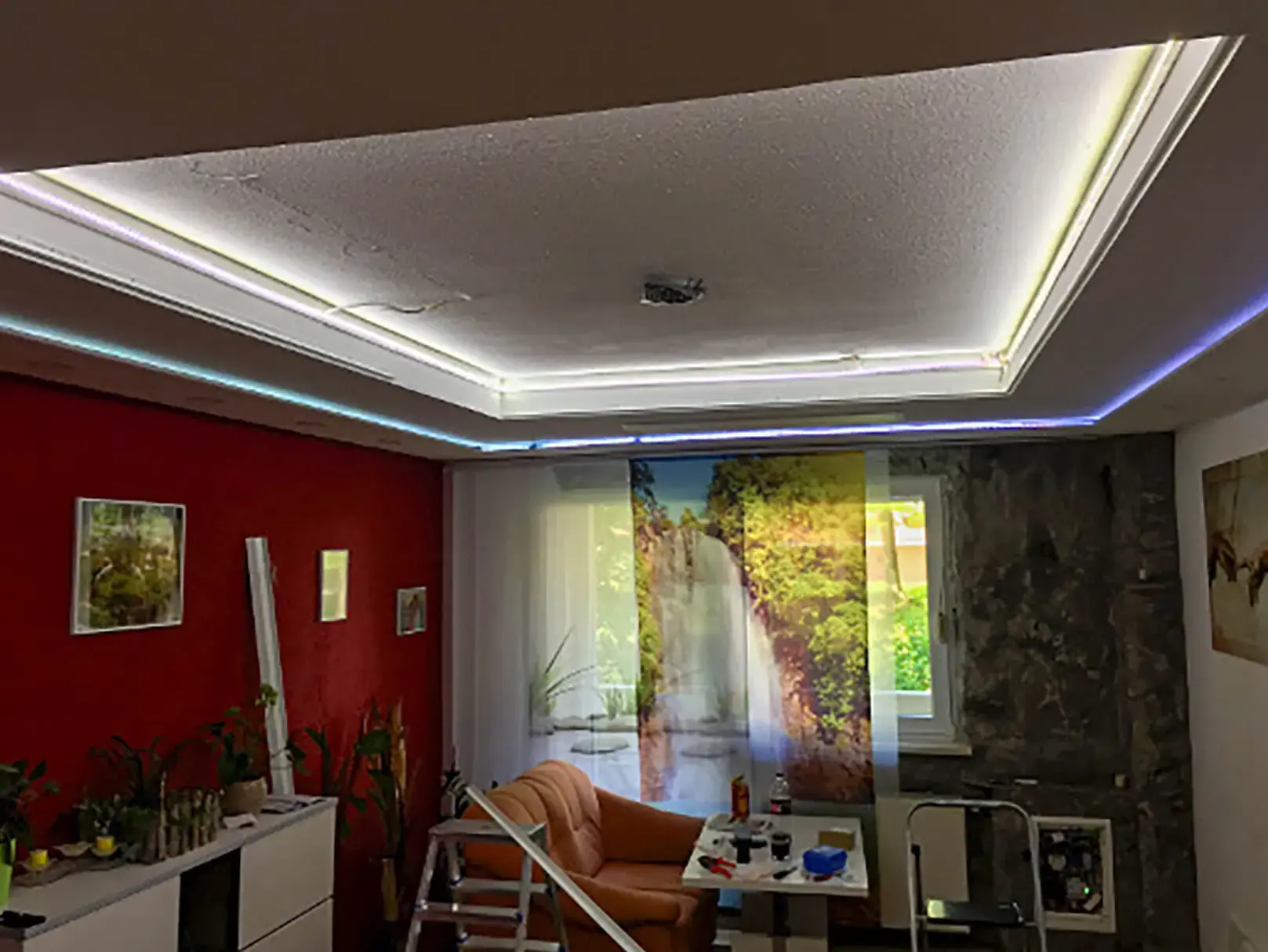 Eine Spanndecke mit Digitaldruck und LED-Hinterleuchtung schafft ein angenehmes, stimmungsvolles Ambiente und sorgt für eine indirekte, gleichmäßige Ausleuchtung des Raumes. Durch die Kombination von Spanndecke und hinterleuchtetem LED-System entsteht eine moderne Lichtlösung, die dem Raum eine freundliche und einladende Atmosphäre verleiht.